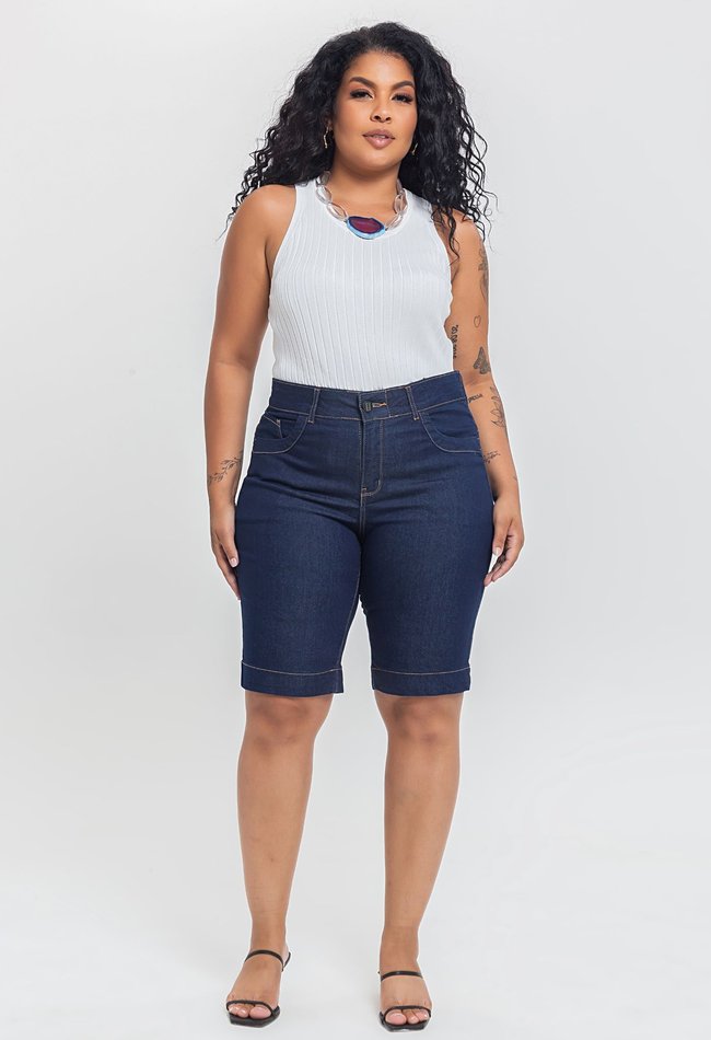 Bermuda ciclista feminina plus size em denim escuro, com cós elástico que proporciona conforto e praticidade. Modelagem ajustada que valoriza a silhueta, ideal para looks casuais ou esportivos com estilo.