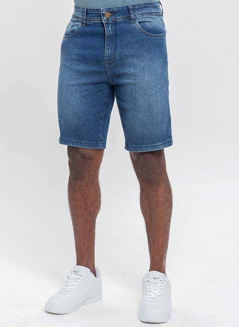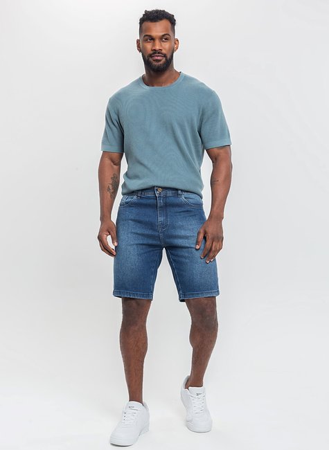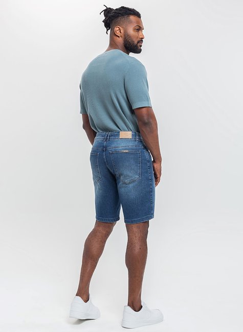 Bermuda masculina em denim escuro, com modelagem moderna e caimento confortável. Versátil e prática, é ideal para compor looks casuais e estilosos no dia a dia.