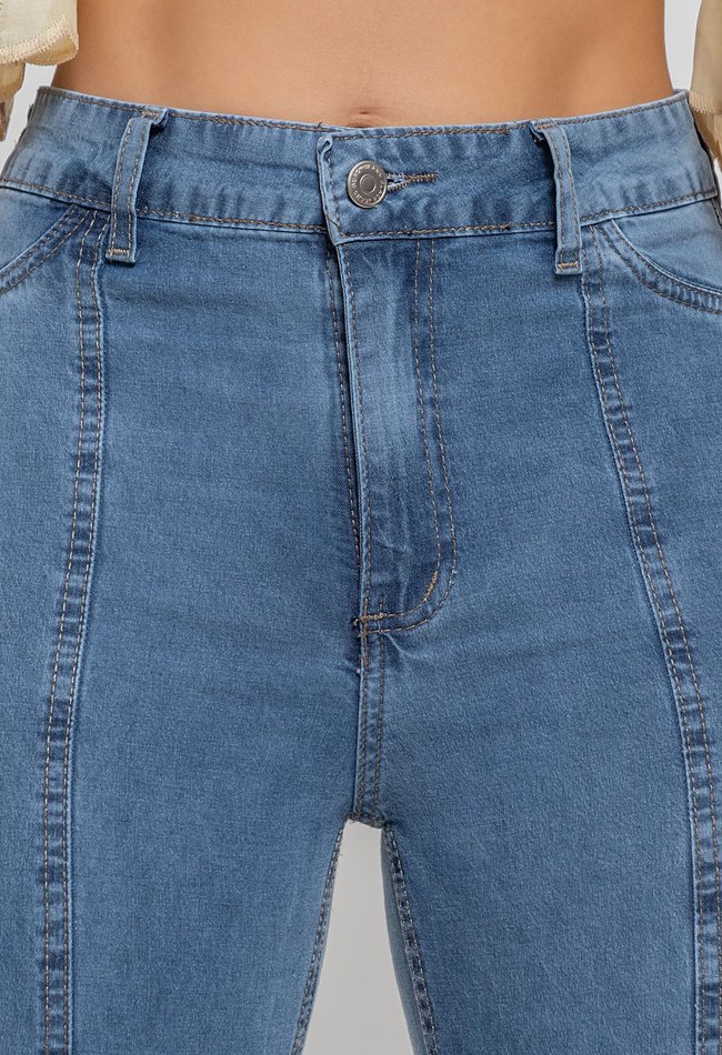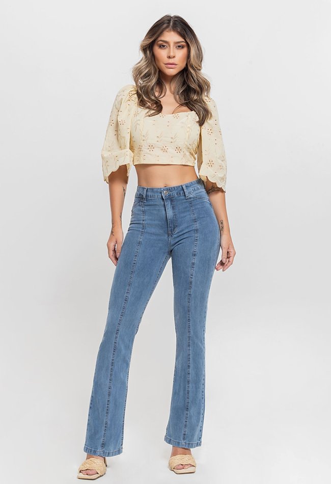 Calça jeans feminina bootcut em denim claro. Modelagem ajustada até o joelho, com leve abertura na barra. Estilo versátil, moderno e confortável para o dia a dia.