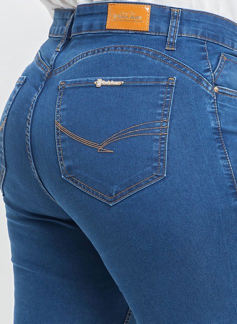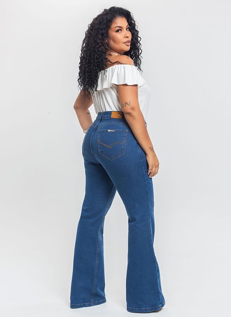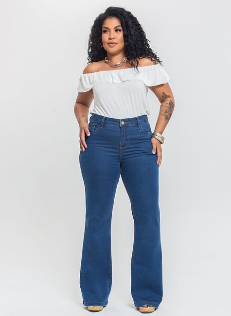 Calça feminina bootcut plus size em denim médio, com modelagem levemente ajustada nas pernas e abertura sutil na barra. Confortável e moderna, valoriza a silhueta e é perfeita para compor looks elegantes e casuais.