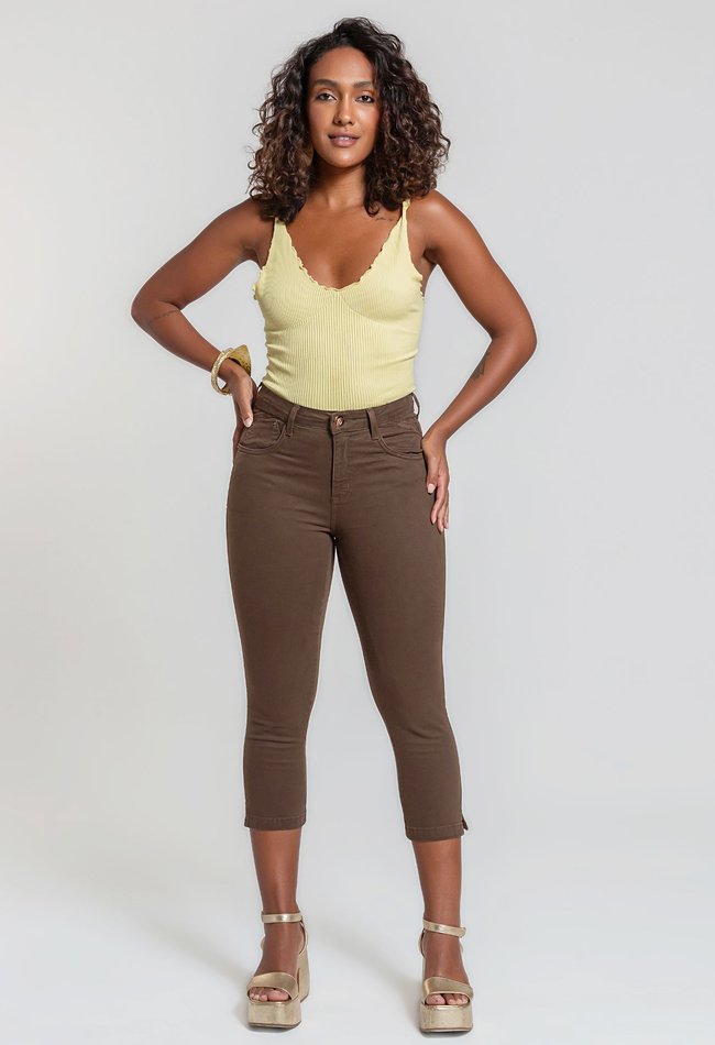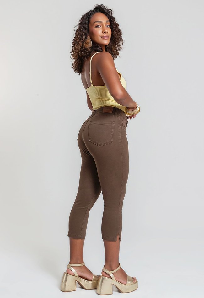 Calça feminina capri em denim, com modelagem ajustada que valoriza a silhueta e garante conforto no dia a dia. O comprimento intermediário deixa o visual moderno e leve, enquanto a pequena fenda na barra adiciona um toque delicado e elegante ao look. Versátil e prática, é perfeita para compor produções casuais ou mais sofisticadas.