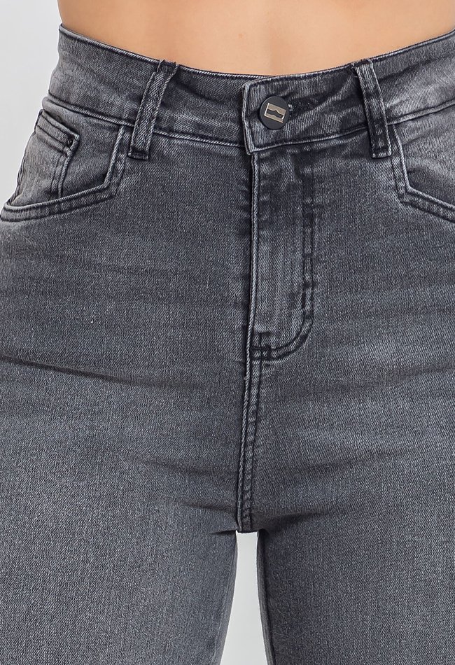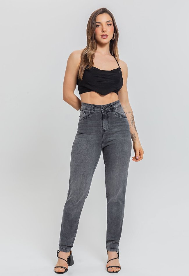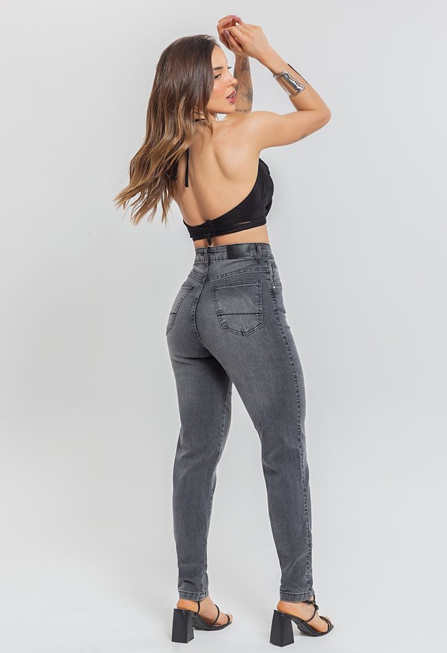 Calça feminina mom em denim preto stonado, com modelagem reta e cintura alta. Peça versátil, com caimento confortável e estilo atemporal para o dia a dia.