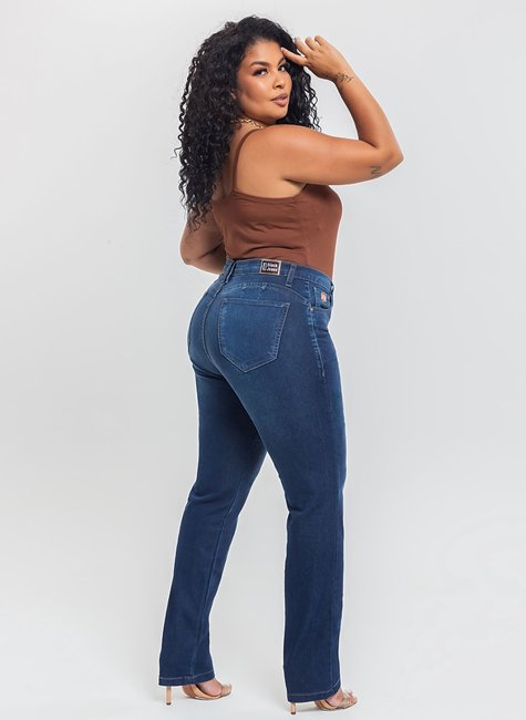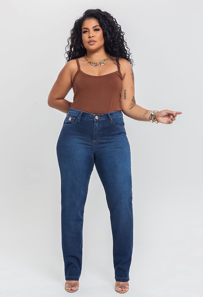 Calça feminina reta plus size em denim escuro, com modelagem clássica que valoriza o corpo e proporciona conforto. Versátil e elegante, ideal para compor looks casuais ou sociais com praticidade e estilo.