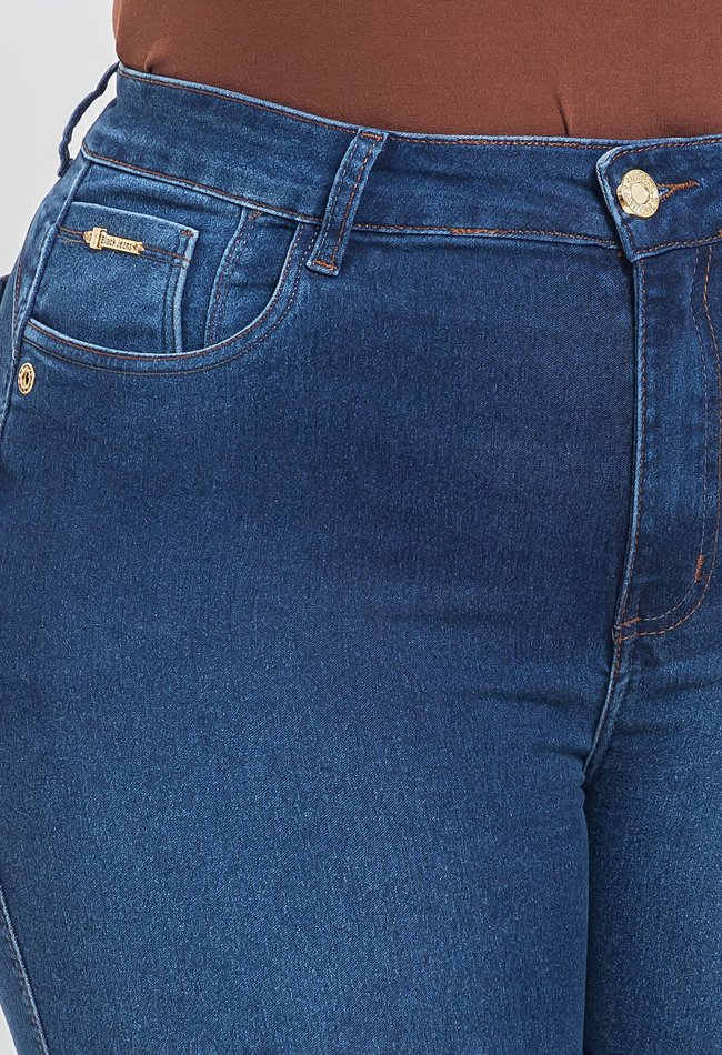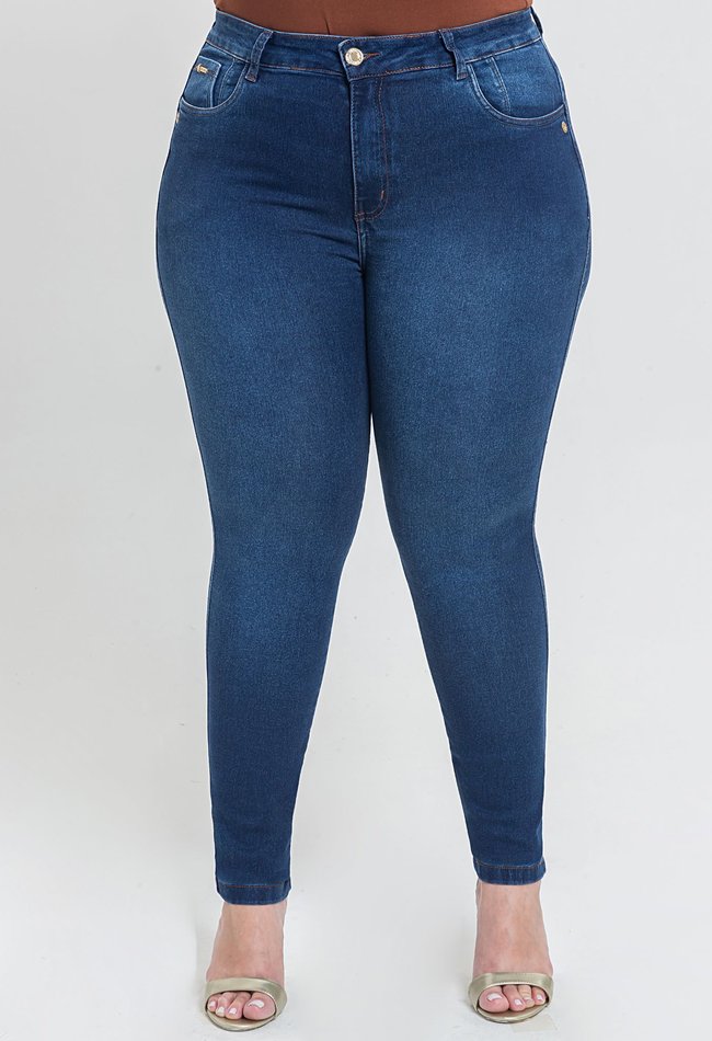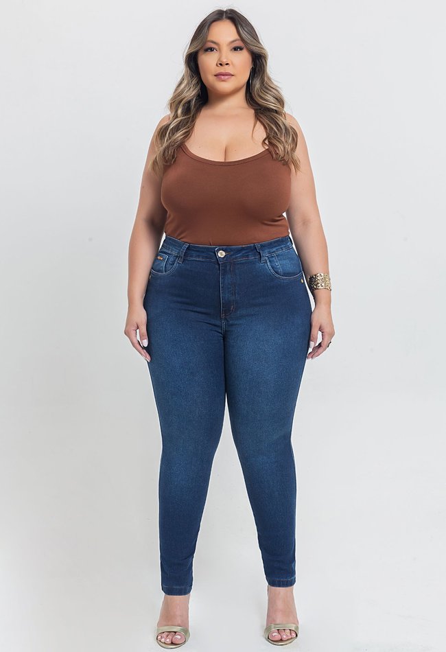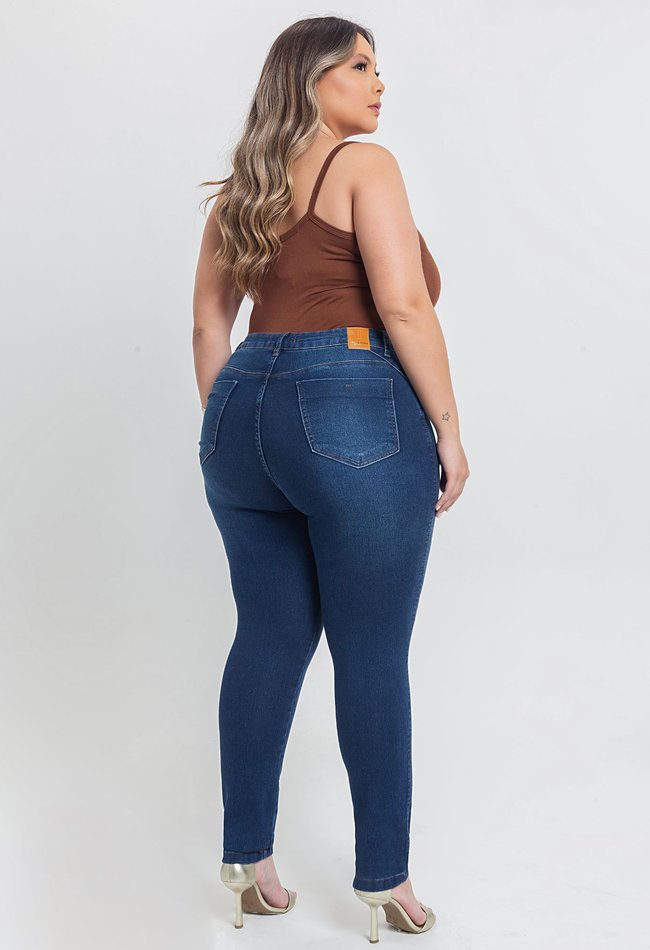 Calça jeans feminina skinny plus size em denim escuro. Modelagem ajustada que valoriza as curvas com conforto, graças ao tecido com elastano. Cintura alta e acabamento clássico, perfeita para compor desde looks casuais até produções mais elegantes. Versátil e essencial no guarda-roupa feminino.