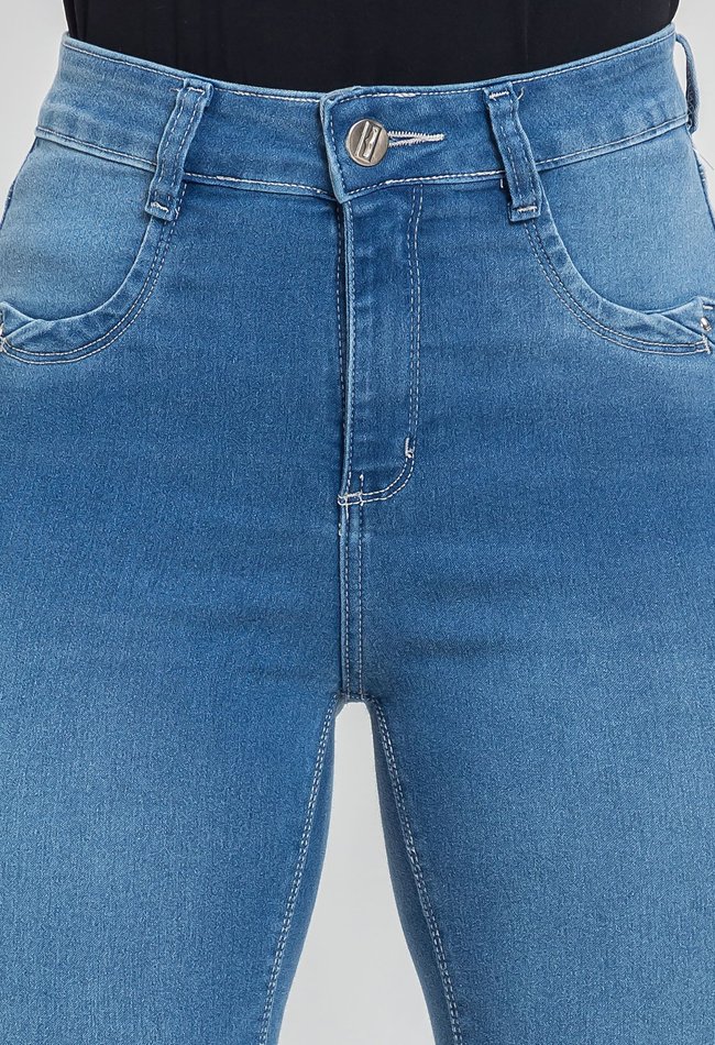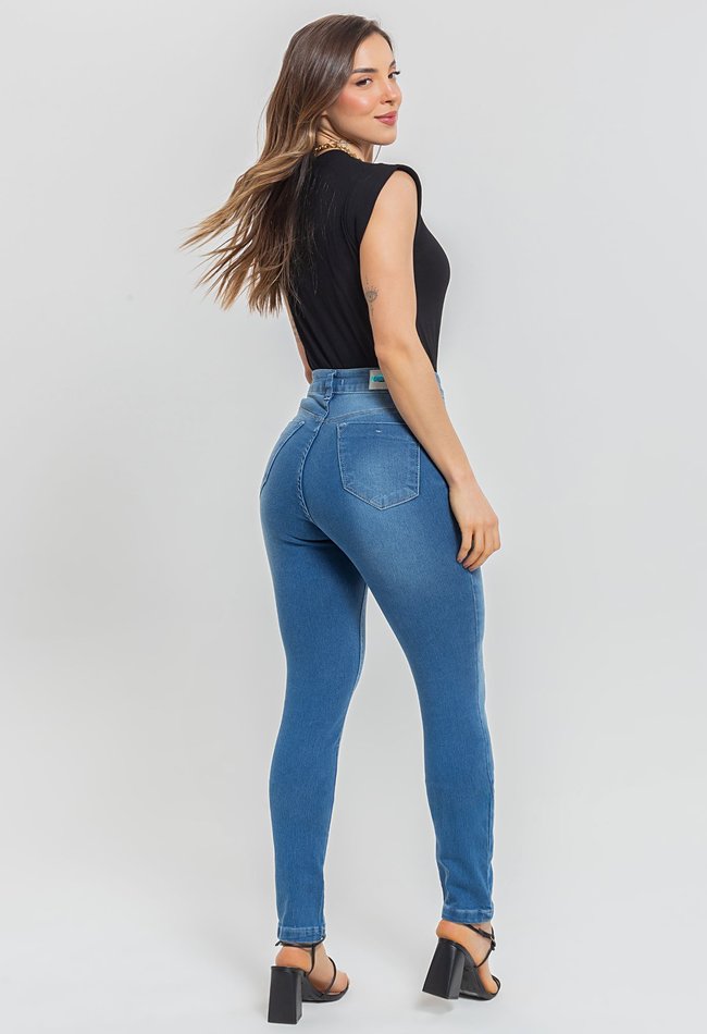 Calça feminina skinny em denim médio, com modelagem ajustada que valoriza as curvas e garante conforto. Peça versátil para compor looks modernos no dia a dia.