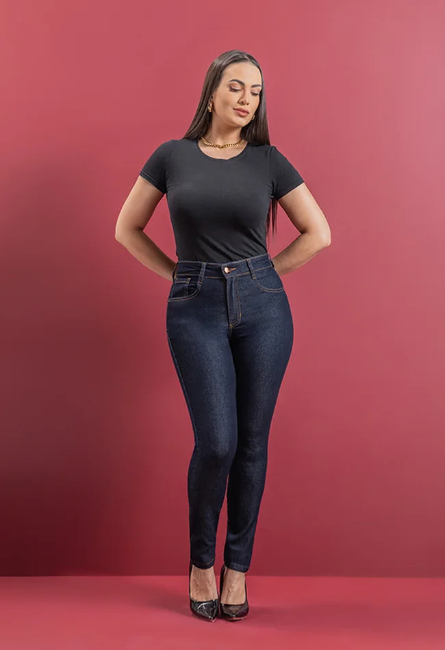 A calça feminina jeans skinny é uma peça de modelagem justa, que se ajusta ao corpo desde a cintura até os tornozelos, criando um visual slim e contemporâneo. Confeccionada em tecido jeans com um toque de elastano, oferece conforto e flexibilidade, além de valorizar a silhueta. Disponível em diferentes lavagens e com opções de detalhes como rasgos ou desfiados, a calça skinny é ideal para looks modernos e versáteis, podendo ser combinada com diversos tipos de blusas, camisetas e sapatos.