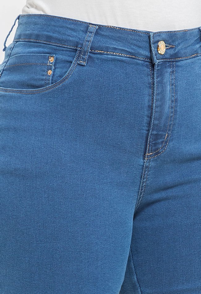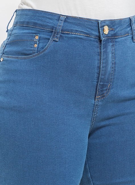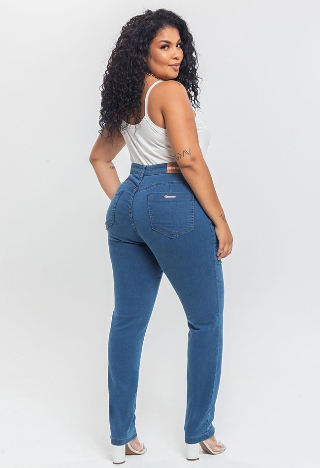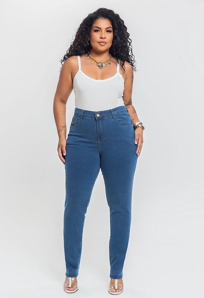 Calça feminina skinny plus size em denim escuro, com modelagem ajustada que valoriza as curvas e oferece conforto. Moderna e versátil, ideal para compor looks estilosos no dia a dia.