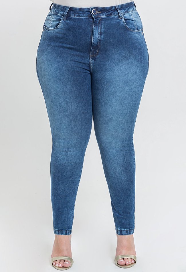 Calça jeans feminina skinny plus size em denim médio. Caimento ajustado, conforto e estilo para o dia a dia. Com bolsos e tecido com elasticidade.