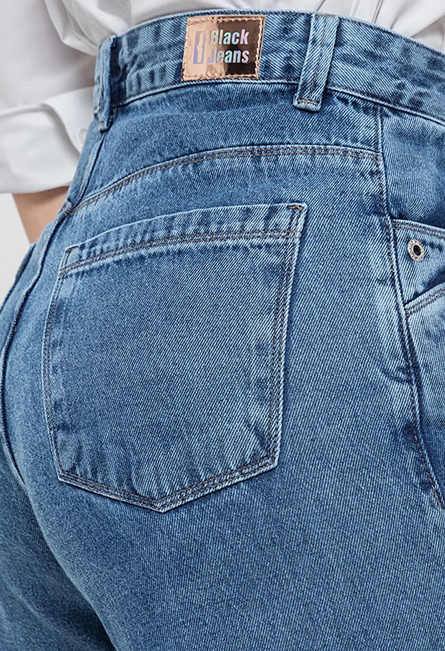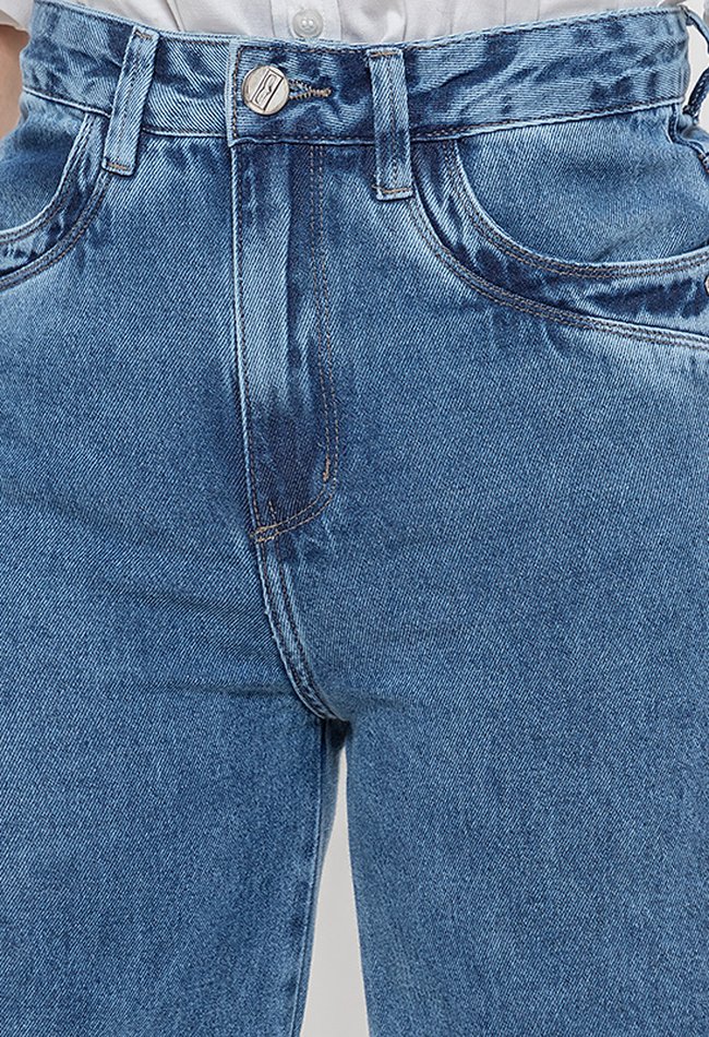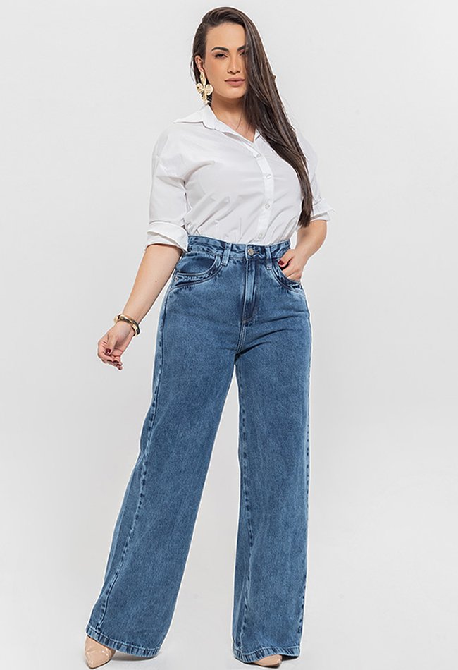 Calça jeans feminina wide leg em denim médio, com caimento solto e cintura alta. Estilo atual, conforto garantido e versatilidade para compor looks modernos no dia a dia.