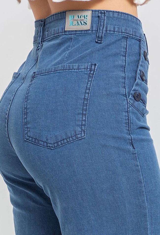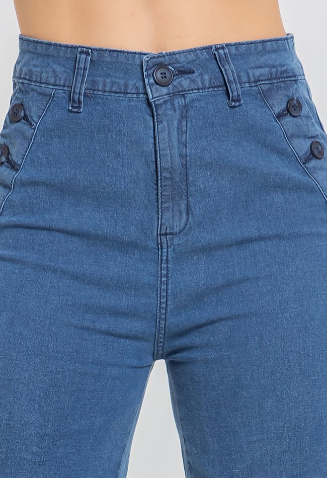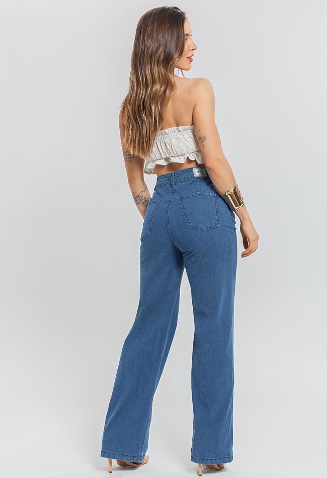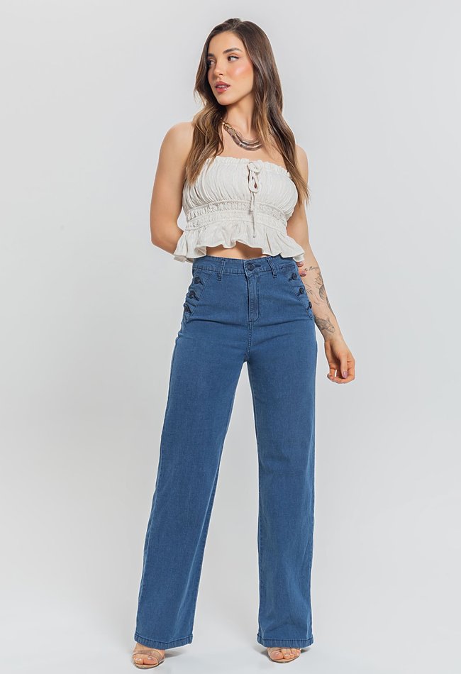 Calça jeans feminina wide leg reta em denim médio, com detalhe moderno de botões laterais. Modelagem ampla, caimento confortável e toque de estilo para o dia a dia.