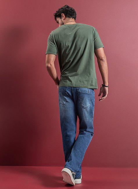 Calça masculina com corte reto em denim de lavagem média. Confortável e atemporal, é ideal para compor looks casuais com um toque clássico. Modelagem que se adapta bem a diferentes corpos, unindo praticidade e estilo no dia a dia.