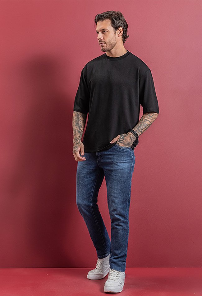 Calça jeans masculina modelo skinny, em denim escuro. Ajuste moderno, caimento confortável e versátil para o dia a dia ou ocasiões casuais.