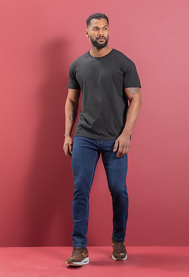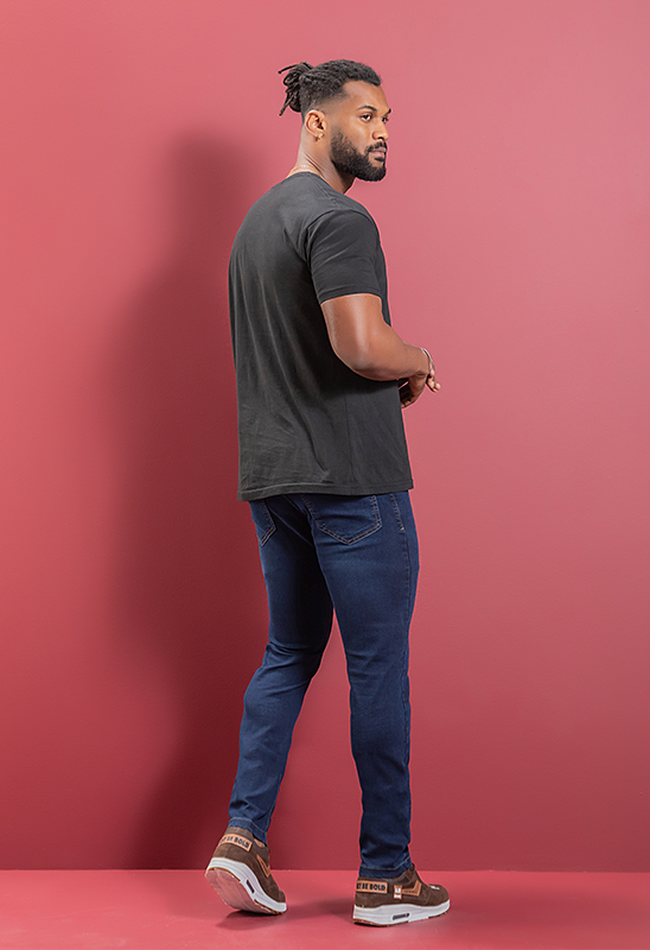 Calça jeans masculina skinny em denim escuro, com modelagem ajustada que garante estilo e conforto para o dia a dia.
