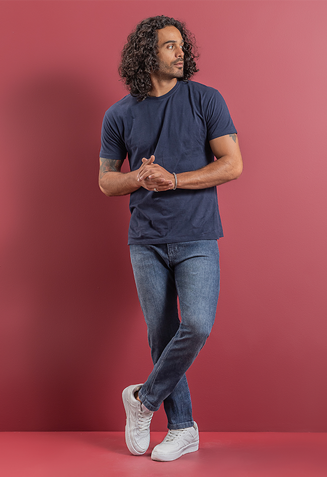 Calça jeans masculina skinny em denim escuro, com caimento ajustado e moderno. Versátil, ideal para compor looks casuais ou urbanos com estilo.