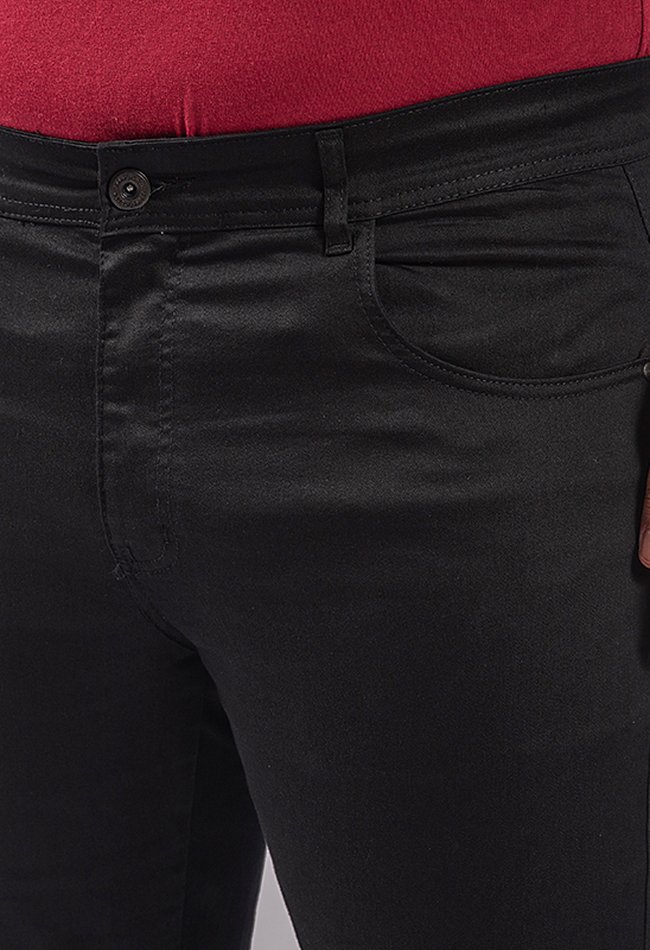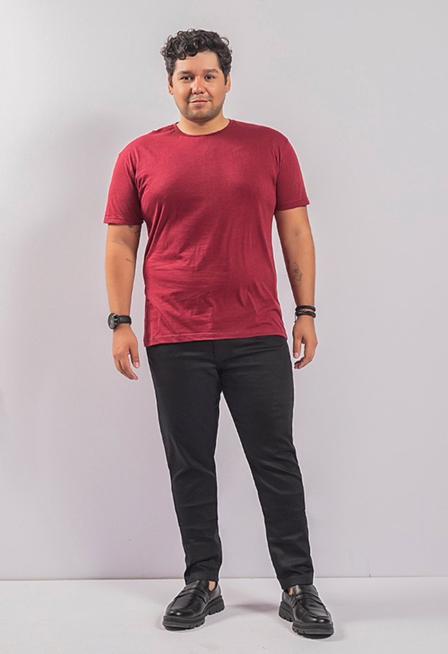 Calça masculina skinny plus size, com modelagem ajustada e conforto ideal. Perfeita para quem busca estilo e praticidade, destacando a silhueta com toque moderno e versátil.
