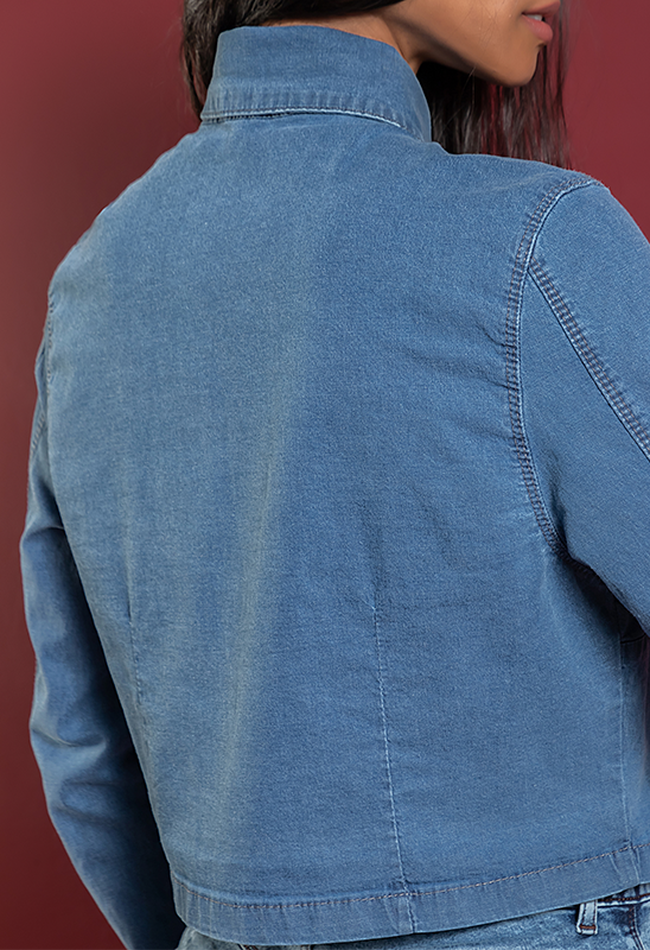 Camisa Feminina Cropped Manga Longa Denim Claro