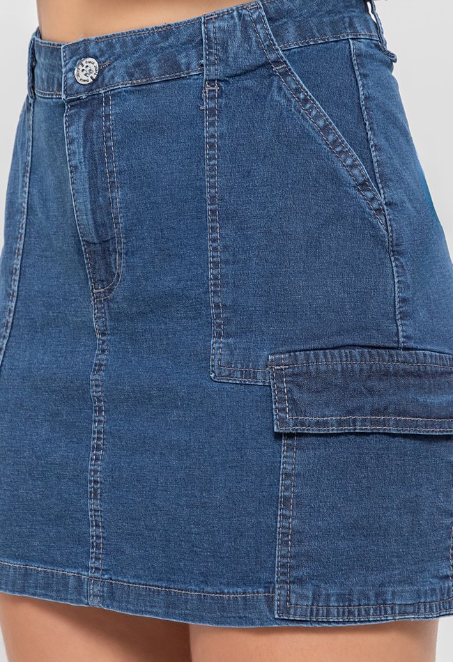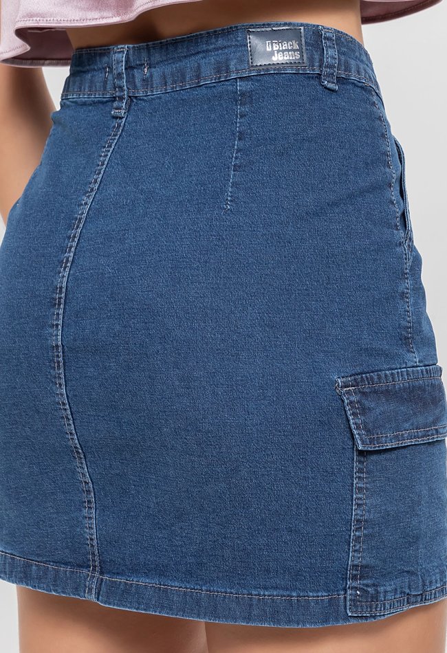Mini saia jeans feminina cargo em denim escuro. Modelagem curta com bolsos utilitários, estilo moderno e versátil para compor looks cheios de atitude.