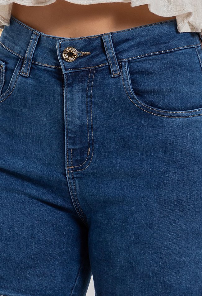 Confeccionado em jeans de lavagem média/escura, possui cintura alta que valoriza a silhueta e garante um caimento firme e confortável. O design clean, sem muitos recortes, traz versatilidade, enquanto o acabamento clássico com costuras aparentes agrega sofisticação à peça.